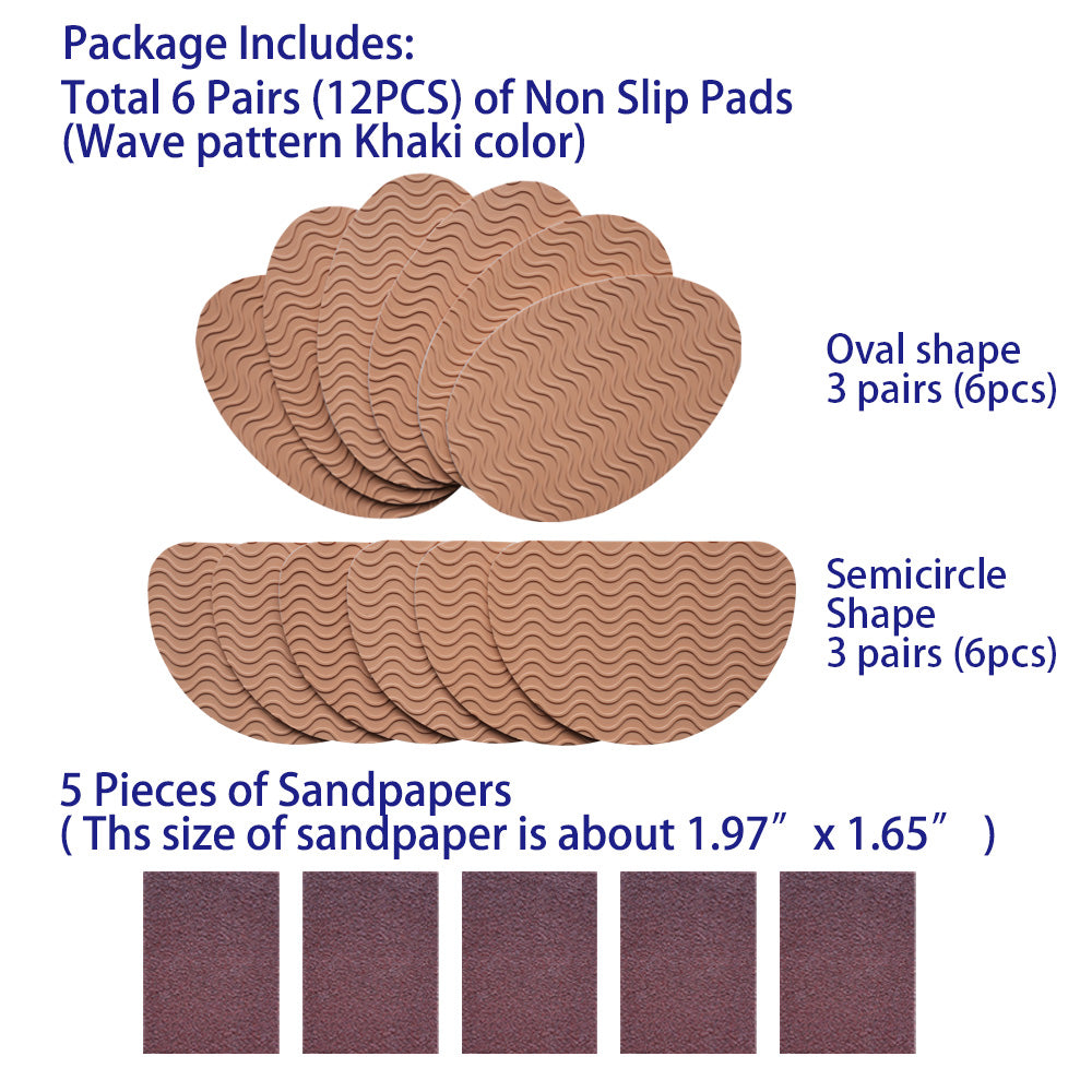 Package contains:6 Pairs (12 pieces ) of non slip pads - Oval shape pads 3 pairs (6pcs) + Semicircle shape pads 3 pairs (6pcs), and 5 pieces of sandpapers.